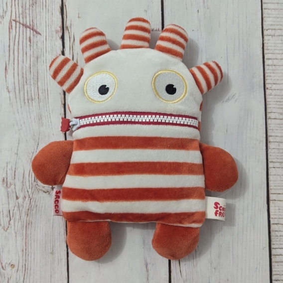 Głodny milutki potworek z rozsuwaną paszczą i schowkiem w brzuchu. Można go karmić różnymi małymi rekwizytami jedzeniowymi lub kartami z jedzeniem. Wymiary 25x19 cm
